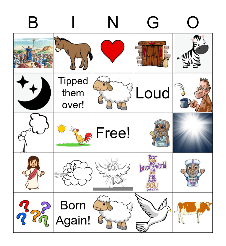 This bingo card has 27 images, a free space and 7 words: NOISY, Tipped them over!, Quiet, Born Again!, Nicodemus, Loud and Cheating!.