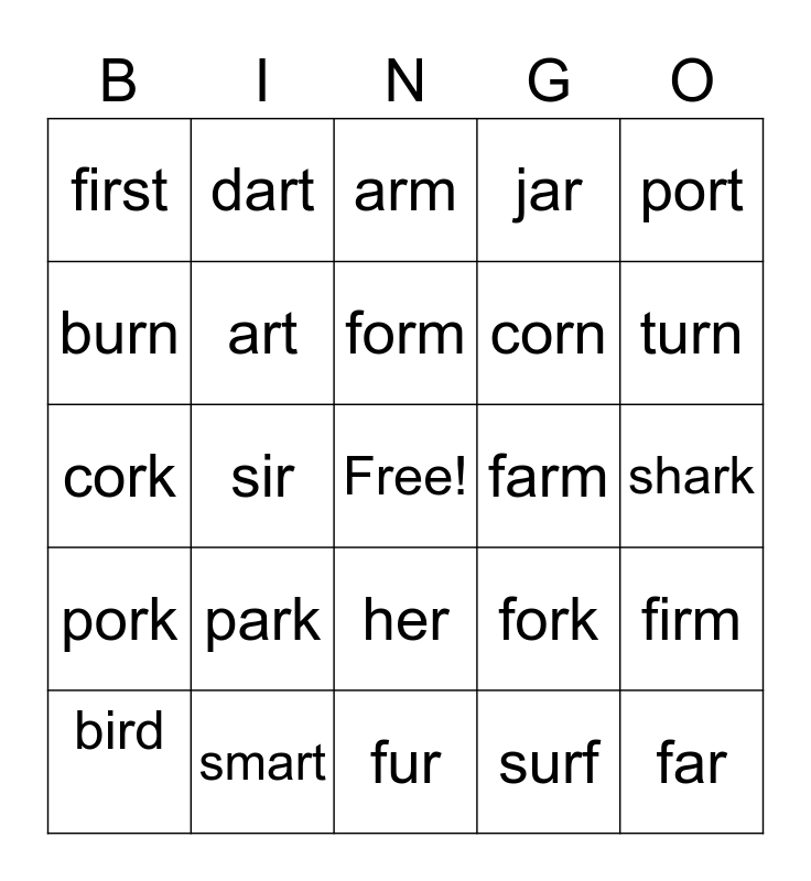This bingo card has a free space and 29 words: bird, stir, sir, dirt, first, arm, art, park, farm, smart, shark, far, fur, surf, turn, term, her, pork, port, cork, fork, first, corn, burn, jar, dart, firm, form and stern.