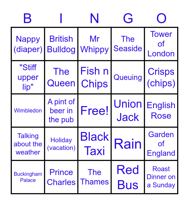 This bingo card has a free space and 36 words: Cream Tea, Afternoon Tea, A nice cup of tea, The Queen, Rain, Talking about the weather, Fish n Chips, Gin and Tonic, Tower of London, Crown Jewels, A pint of beer in the pub, The Seaside, One Pound coin, Union Jack, Crisps (chips), Nappy (diaper), Lift (elevator), Holiday (vacation), Roast Dinner on a Sunday, Mr Whippy, English Rose, Garden of England, Prince Charles, Buckingham Palace, The Thames, British Bulldog, Wimbledon, London Underground (the tube), Queuing, "Stiff upper lip", Big Ben, NHS, Red Bus, Black Taxi, Twiglets and A right Royal knees up.