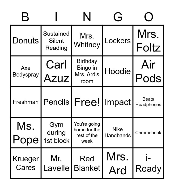 This bingo card has a free space and 39 words: Karley, Dopka, Uno, Carl Azuz, Krueger Cares, You're going home for the rest of the week, Birthday Bingo in Mrs. Ard's room, Spinach, Mrs. Foltz, Ms. Pope, Pencils, Lockers, i-Ready, Beats Headphones, Impact, Gym during 1st block, Field Days, Donuts, 10 Days!!!, Nike Handbands, Axe Bodyspray, Red Blanket, Hoodie, Air Pods, Mulan, Mrs. Hekter, Mr. & Mrs. Jones, Planner, A Colt, Sustained Silent Reading, Sk8 World, Inman's, Mrs. Whitney, Mr. Lavelle, Mrs. Ard, Mr. Malone, Chromebook, Freshman and 200.