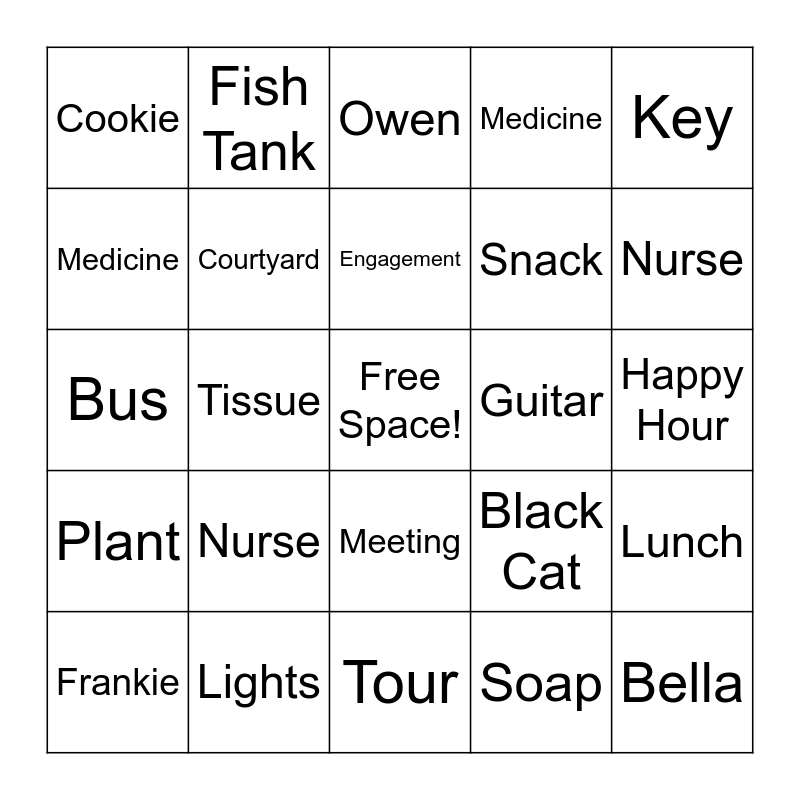 This bingo card has a free space and 24 words: Frankie, Nurse, Engagement, Soap, Key, Cookie, Fish Tank, Owen, Guitar, Happy Hour, Bus, Courtyard, Black Cat, Lunch, Medicine, Lights, Tour, Medicine, Nurse, Plant, Tissue, Meeting, Snack and Bella.