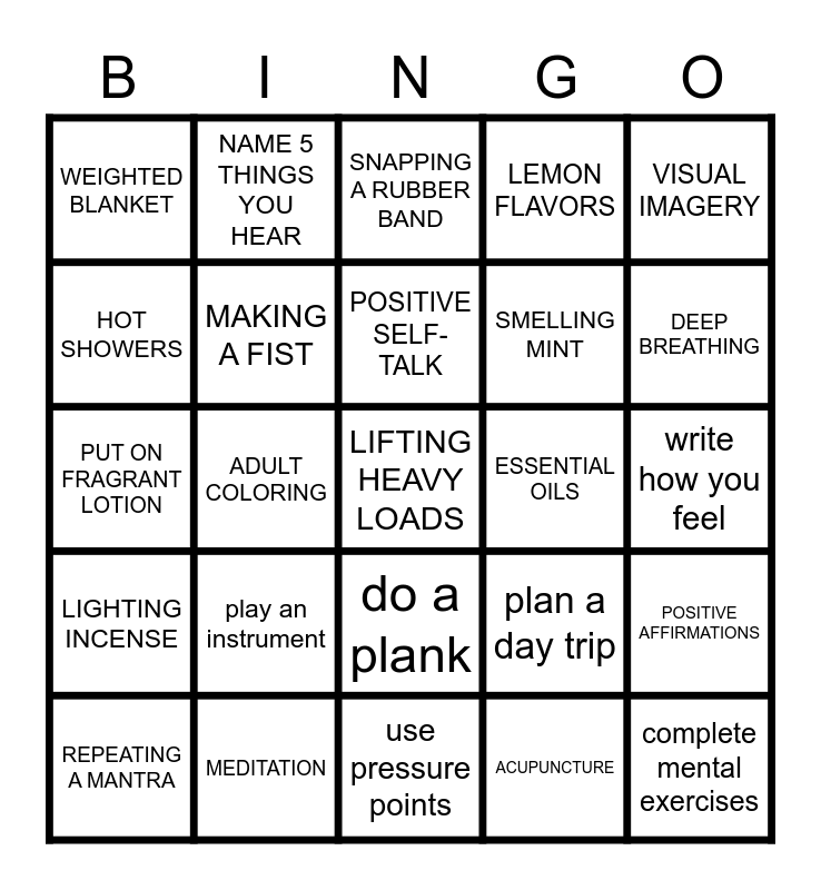 This bingo card has 60 words: use mindfulness, MEDITATION, YOGA, LIGHTING INCENSE, ACUPUNCTURE, PUSH UPS, MAKING A FIST, CLENCHING YOUR JAW, SMELLING MINT, TASTING CINNAMON, LEMON FLAVORS, COLD SHOWERS, HOT SHOWERS, CALM MUSIC, ALERTING MUSIC, WEIGHTED BLANKET, LIFTING HEAVY LOADS, VISUAL IMAGERY, COUNTING BACKWARDS, POSITIVE SELF-TALK, ESSENTIAL OILS, SNAPPING A RUBBER BAND, REPEATING A MANTRA, POSITIVE AFFIRMATIONS, HOLD A PIECE OF ICE, TAKE A LONG WALK, GARDENING, BRING AWARENESS TO YOUR SURROUNDINGS, DEEP BREATHING, MAKE YOURSELF LAUGH, DO COMPLICATED MATH PROBLEMS, cuddle with your pet, PLACE FEET ON FLOOR, NAME 5 THINGS YOU SEE, NAME 5 THINGS YOU HEAR, NAME 5 THINGS TO TOUCH, NAME 5 THINGS YOU SMELL, ADULT COLORING, JOURNAL WRITING, PUT ON FRAGRANT LOTION, DRINK HERBAL TEA, play an instrument, write how you feel, go for a hike, plan a day trip, rock in a rocking chair, drink cold water, lay in a hammock, slowly rock your body, do a plank, use pressure points, listen to loud music, listen to soft music, pinch yourself, chew gum, take a warm bath, do jumping jacks, 5,4,3,2,1 exercise, complete mental exercises and paint.