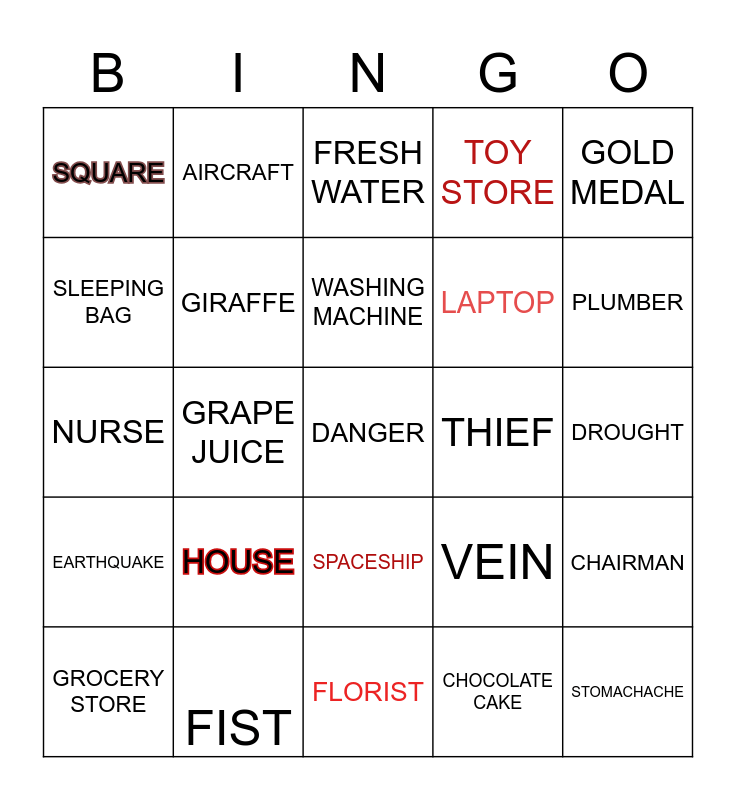This bingo card has a free space and 24 words: HOUSE, FIST, WASHING MACHINE, GROCERY STORE, GOLD MEDAL, SQUARE, SLEEPING BAG, AIRCRAFT, THIEF, SPACESHIP, LAPTOP, NURSE, VEIN, CHAIRMAN, GIRAFFE, CHOCOLATE CAKE, DROUGHT, FRESH WATER, PLUMBER, GRAPE JUICE, STOMACHACHE, EARTHQUAKE, TOY STORE and FLORIST.