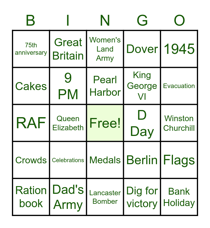 This bingo card has a free space and 68 words: 8th May, Bank Holiday, Street Party, Bunting, Union Jack, World War II, Great Britain, Rations, Pearl Harbor, Victory, Medals, Morse Code, Winston Churchill, 1945, Freedom, Cakes, Queen Elizabeth, 75th anniversary, VE Day, Celebrations, King George VI, Berlin, Crowds, Veterans, Queen's speech, Singalong, Vera Lynn, We'll meet again, Flags, Red Arrows, Women's Land Army, Heroes, Sacrifice, Dunkirk, Dover, Blitz, Make do and mend, Ration book, Evacuation, RAF, Piccadilly Circus, 3 PM, 9 PM, 50,000, Blackouts, Rosie the riveter, Women's Voluntary Service, Squander Bug, D Day, Dad's Army, Auxiliary Territorial Service, Women's Auxiliary Air Force (WAAF), Women's Royal Naval Service (WRNS), Lancaster Bomber, Keep Calm and Carry on, Victory Rolls, Dig for victory, Enigma Code, Wireless, Gramophone, First Aid Nursing Yeomanry (FANY), Women's Timber Corps (WTC), Surrender, Peace, National Savings Stamps, Propaganda, Survival and Bluebirds.