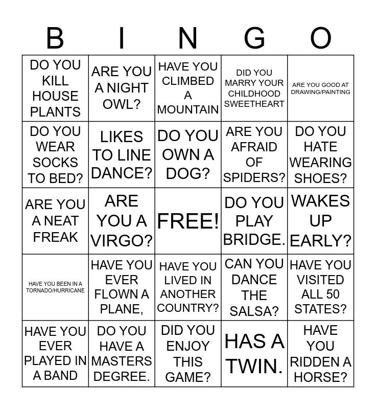 This bingo card has a free space and 24 words: HAVE YOU EVER FLOWN A PLANE,, DO YOU HAVE A MASTERS DEGREE., DO YOU OWN A DOG?, HAVE YOU EVER PLAYED IN A BAND, ARE YOU GOOD AT DRAWING/PAINTING, DO YOU KILL HOUSE PLANTS, DO YOU WEAR SOCKS TO BED?, ARE YOU A NIGHT OWL?, DO YOU PLAY BRIDGE., HAVE YOU LIVED IN ANOTHER COUNTRY?, ARE YOU AFRAID OF SPIDERS?, ARE YOU A NEAT FREAK, CAN YOU DANCE THE SALSA?, HAVE YOU VISITED ALL 50 STATES?, LIKES TO LINE DANCE?, HAS A TWIN., WAKES UP EARLY?, HAVE YOU CLIMBED A MOUNTAIN, DO YOU HATE WEARING SHOES?, ARE YOU A VIRGO?, HAVE YOU RIDDEN A HORSE?, HAVE YOU BEEN IN A TORNADO/HURRICANE, DID YOU MARRY YOUR CHILDHOOD SWEETHEART and DID YOU ENJOY THIS GAME?.