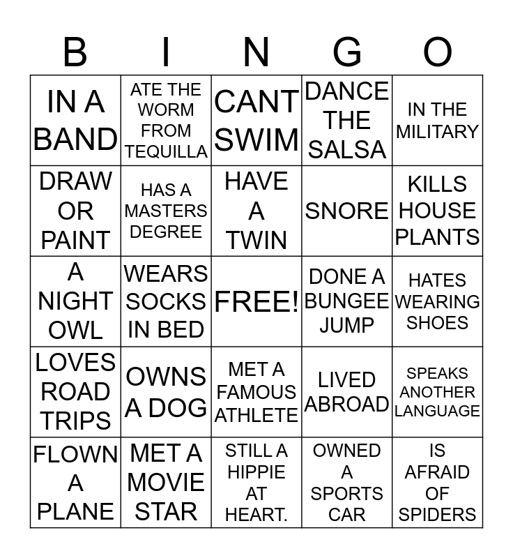 This bingo card has a free space and 24 words: OWNS A DOG, MET A MOVIE STAR, HAVE A TWIN, FLOWN A PLANE, IN THE MILITARY, IN A BAND, DRAW OR PAINT, ATE THE WORM FROM TEQUILLA, DONE A BUNGEE JUMP, MET A FAMOUS ATHLETE, SNORE, A NIGHT OWL, LIVED ABROAD, SPEAKS ANOTHER LANGUAGE, HAS A MASTERS DEGREE, OWNED A SPORTS CAR, HATES WEARING SHOES, CANT SWIM, KILLS HOUSE PLANTS, WEARS SOCKS IN BED, IS AFRAID OF SPIDERS, LOVES ROAD TRIPS, DANCE THE SALSA and STILL A HIPPIE AT HEART..