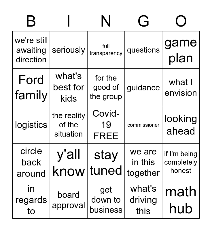 This bingo card has a free space and 29 words: in regards to, unprecedented times, the reality of the situation, clear as mud, we're still awaiting direction, full transparency, what's best for kids, y'all know, commissioner, board approval, looking ahead, math hub, get down to business, what's driving this, what I envision, if you will, stay tuned, circle back around, game plan, logistics, we are in this together, more information to come, guidance, Ford family, questions, seriously, if I'm being completely honest, for the good of the group and bird-walk.