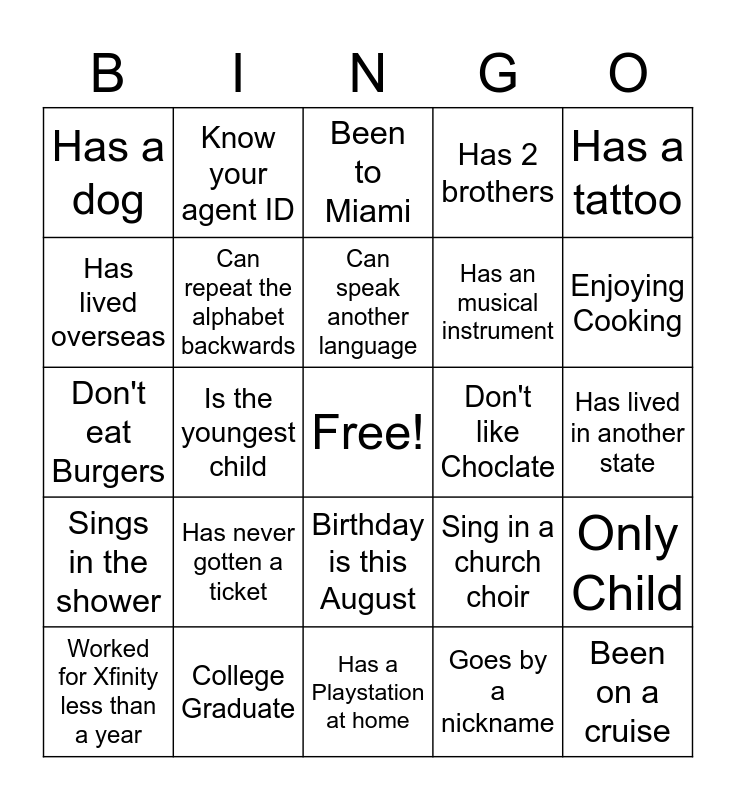 This bingo card has a free space and 24 words: Worked for Xfinity less than a year, Has never gotten a ticket, Can speak another language, Goes by a nickname, Has a tattoo, Has a dog, Know your agent ID, Been to Miami, Don't like Choclate, Has lived in another state, Don't eat Burgers, Can repeat the alphabet backwards, Sing in a church choir, Only Child, Has lived overseas, College Graduate, Has a Playstation at home, Has 2 brothers, Enjoying Cooking, Sings in the shower, Is the youngest child, Birthday is this August, Has an musical instrument and Been on a cruise.