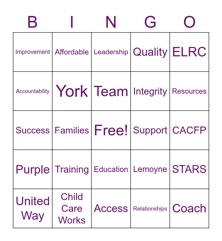 This bingo card has a free space and 36 words: Child, Care, Consultants, York, Lemoyne, Purple, Team, Empower, ELRC, Zoom, Families, Quality, Providers, Support, Resources, Improvement, Referral, Training, Coach, Leadership, CACFP, STARS, Child Care Works, United Way, Access, Affordable, Success, Thrive, Integrity, Accountability, Excellence, Impact, Relationships, Education, Specialist and Community.