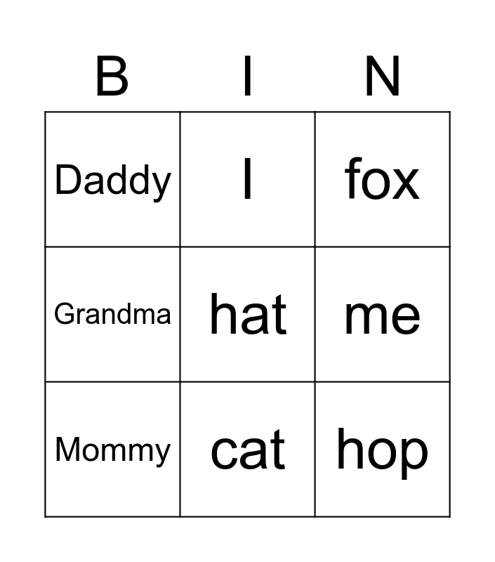 This bingo card has a free space and 8 words: me, fox, I, Mommy, Daddy, hop, Grandma and cat.