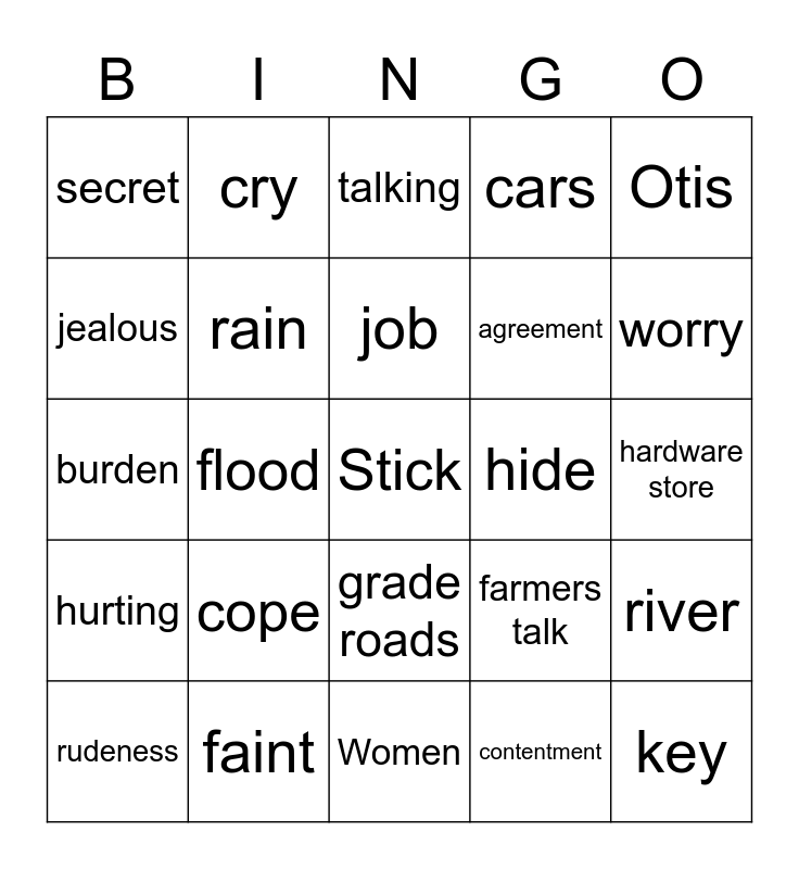 This bingo card has a free space and 24 words: cope, faint, job, rudeness, Otis, secret, jealous, cry, hide, grade roads, agreement, burden, farmers talk, river, rain, contentment, hardware store, talking, worry, flood, key, hurting, cars and Women.