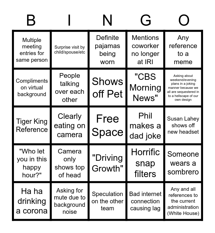 This bingo card has a free space and 24 words: Camera only shows top of head, Asking for mute due to background noise, Shows off Pet, Ha ha drinking a corona, Any reference to a meme, Multiple meeting entries for same person, Compliments on virtual background, Surprise visit by child/spouse/etc, Phil makes a dad joke, "Driving Growth", "CBS Morning News", Tiger King Reference, Horrific snap filters, Someone wears a sombrero, People talking over each other, Bad internet connection causing lag, Susan Lahey shows off new headset, Definite pajamas being worn, Asking about weekend/evening plans in a joking manner because we all are sequestered in to a hellscape of our own design, Clearly eating on camera, Any and all references to the current administration (White House), "Who let you in this happy hour?", Mentions coworker no longer at IRI and Speculation on the other team.