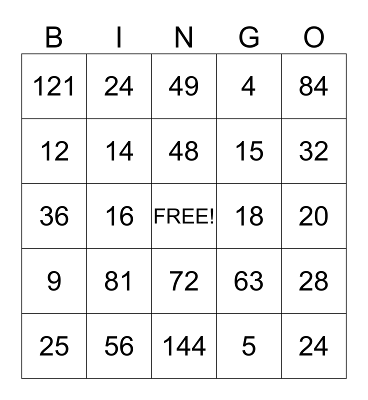 This bingo card has a free space and 24 words: 81, 56, 48, 25, 84, 121, 12, 24, 18, 72, 15, 36, 63, 28, 14, 5, 20, 49, 32, 16, 24, 9, 4 and 144.