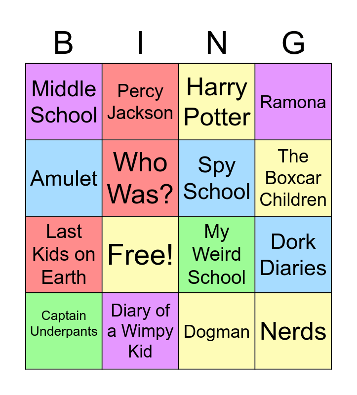 This bingo card has 16 words: Diary of a Wimpy Kid, Dork Diaries, Harry Potter, Middle School, Last Kids on Earth, Percy Jackson, My Weird School, Dogman, Amulet, Who Was?, Captain Underpants, Ramona, Free!, The Boxcar Children, Spy School and Nerds.