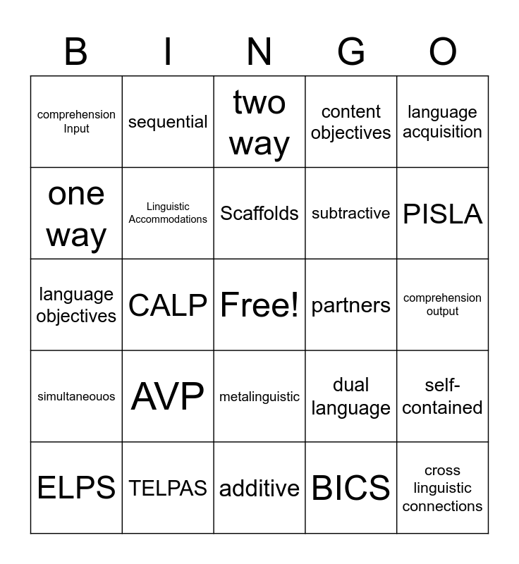 This bingo card has a free space and 27 words: dual language, transitional, subtractive, additive, one way, two way, sequential, simultaneouos, partners, self-contained, language objectives, content objectives, ELPS, TELPAS, PISLA, Sheltered Instruction, Linguistic Accommodations, Scaffolds, AVP, comprehension Input, comprehension output, BICS, CALP, cross linguistic connections, metalinguistic, language acquisition and Performance Descriptors.