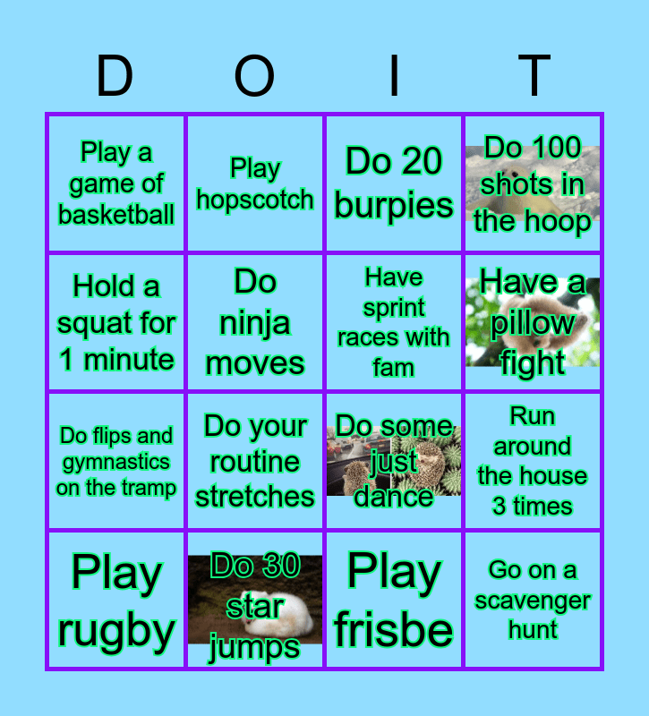 This bingo card has 4 images and 16 words: Do 30 star jumps, Run around the house 3 times, Do 20 burpies, Play a game of basketball, Do flips and gymnastics on the tramp, Play hopscotch, Do some just dance, Play frisbe, Hold a squat for 1 minute, Do ninja moves, Play rugby, Do 100 shots in the hoop, Do your routine stretches, Have a pillow fight, Have sprint races with fam and Go on a scavenger hunt.