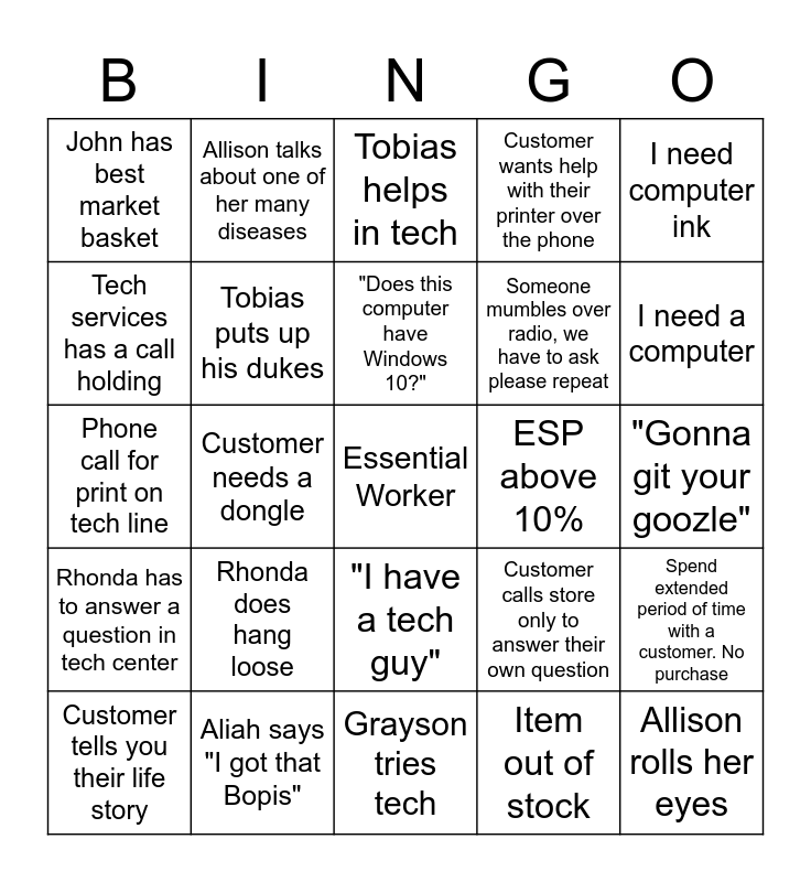 This bingo card has a free space and 24 words: Rhonda does hang loose, Aliah says "I got that Bopis", "Does this computer have Windows 10?", Customer tells you their life story, I need computer ink, John has best market basket, Tech services has a call holding, Allison talks about one of her many diseases, ESP above 10%, "I have a tech guy", Someone mumbles over radio, we have to ask please repeat, Phone call for print on tech line, Customer calls store only to answer their own question, Spend extended period of time with a customer. No purchase, Tobias puts up his dukes, Item out of stock, "Gonna git your goozle", Tobias helps in tech, I need a computer, Customer needs a dongle, Allison rolls her eyes, Rhonda has to answer a question in tech center, Customer wants help with their printer over the phone and Grayson tries tech.