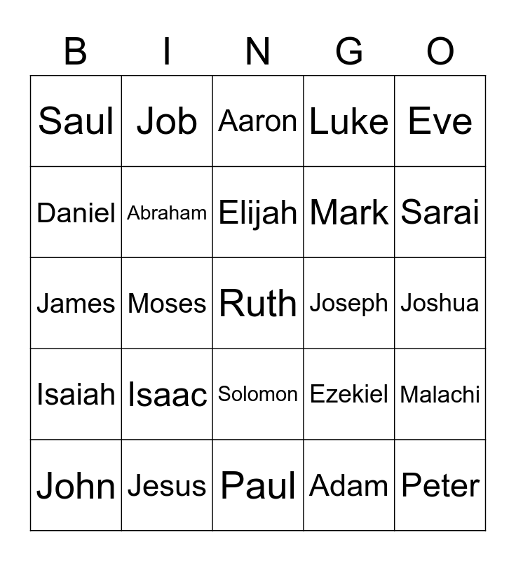 This bingo card has 30 words: Jesus, David, Moses, Jacob, Saul, Aaron, Abraham, Solomon, Joseph, Paul, Joshua, Ruth, Adam, Peter, Sarai, Samuel, Ezekiel, Isaiah, Isaac, Eve, James, Matthew, Job, Mark, Daniel, Luke, Malachi, John, Elijah and Noah.