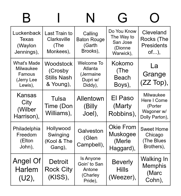 This bingo card has 44 words: Free!, Allentown (Billy Joel),, Amarillo By Morning (George Strait),, Angel Of Harlem (U2),, The Battle of New Orleans (Johnny Horton),, Beverly Hills (Weezer),, Calling Baton Rouge (Garth Brooks),, Chattanooga Choo Choo (Asleep At The Wheel),, Cleveland Rocks (The Presidents of...),, Detroit Rock City (KISS),, Do You Know The Way to San Jose (Dionne Warwick),, El Paso (Marty Robbins),, Galveston (Glen Campbell),, Hollywood Swinging (Kool & The Gang),, I'm Shipping Up To Boston (Dropkick Murphys),, Is Anyone Goin' to San Antone (Charley Pride),, Jackson (Johnny Cash w/ June Carter Cash),, Kansas City (Wilber Harrison),, L.A. Woman The Doors),, La Grange (ZZ Top),, Last Train to Clarksville (The Monkees),, The Little Old Lady (From Pasadena) (Jan & Dean),, Little Rock (Reba McEntire),, Luckenback Texas (Waylon Jennings),, Miami (Will Smith),, Milwaukee Here I Come (Porter Wagoner w/ Dolly Parton),, The Night Chicago Died (Paper Lace),, No Sleep Till Brooklyn (Beastie Boys),, Okie From Muskogee (Merle Haggard),, Philadelphia Freedom (Elton John),, St. Louis Blues (LaVern Baker),, Sweet Home Chicago (The Blues Brothers),, Talladega (Eric Church),, Theme From New York New York (Frank Sinatra),, Tulsa Time (Don Williams),, Ventura Highway (America),, Viva Las Vegas (Elvis Presley),, Walking In Memphis (Marc Cohn),, Welcome To Atlanta (Jermaine Dupri w/ Diddy),, What's Made Milwaukee Famous (Jerry Lee Lewis),, Kokomo (The Beach Boys),, The City of New Orleans (Arlo Guthrie),, Woodstock (Crosby Stills Nash & Young), and Please Come to Boston (Dave Loggins),.