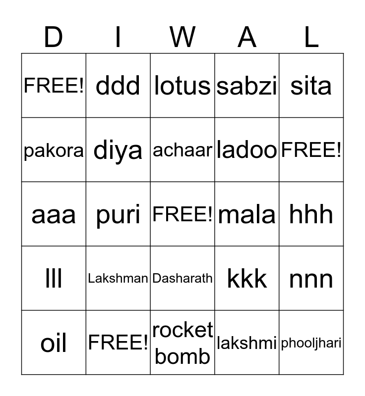 This bingo card has a free space and 45 words: FREE!, phooljhari, batti, oil, ganesha, lakshmi, lotus, ram, sita, FREE!, sabzi, mala, Dasharath, Lakshman, Soorpnakha, rocket bomb, chakri, aaa, bbb, FREE!, ddd, eee, fff, FREE!, ggg, hhh, iii, jjj, kkk, lll, mmm, nnn, yyy, kkk, halwa, puri, jalebi, aloo sabzi\, dahi bada, achaar, pakora, ladoo, rangoli, diya and hanuman.