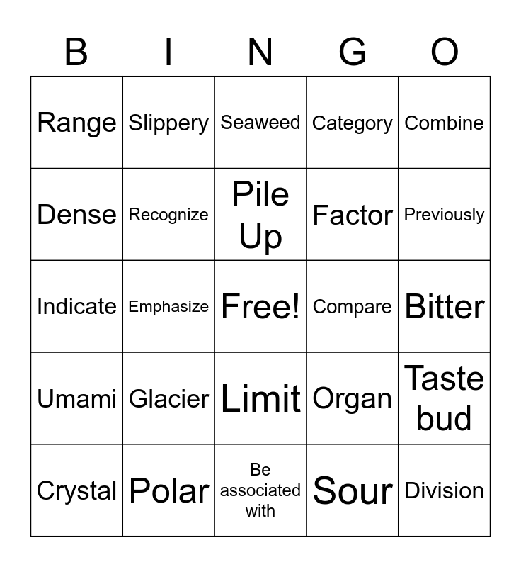 This bingo card has a free space and 24 words: Glacier, Polar, Pile Up, Crystal, Combine, Range, Dense, Slippery, Compare, Limit, Factor, Indicate, Organ, Taste bud, Recognize, Sour, Bitter, Seaweed, Previously, Emphasize, Division, Umami, Category and Be associated with.