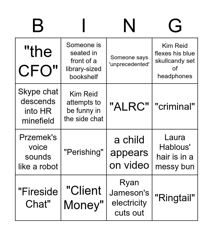 This bingo card has 26 words: "Why not litigate?", Someone speaks whilst on mute, "criminal", Apology for late arrival, Skype chat descends into HR minefield, "the CFO", Kim Reid attempts to be funny in the side chat, Someone is seated in front of a library-sized bookshelf, Ryan Jameson's electricity cuts out, Pet noises, Przemek's voice sounds like a robot, a child appears on video, "Pulse", "300%", Laura Hablous' hair is in a messy bun, "James Shipton", Kim Reid flexes his blue skullcandy set of headphones, "Ringtail", Someone says 'unprecedented', "Fireside Chat", "Perishing", Someone asks if you can hear them, "Client Money", Plane noise heard, "ALRC" and "enforceable undertaking".