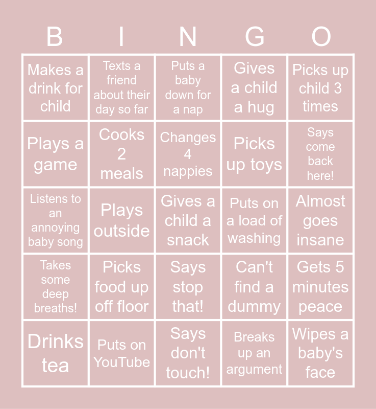 This bingo card has 25 words: Picks food up off floor, Says don't touch!, Changes 4 nappies, Drinks tea, Picks up child 3 times, Makes a drink for child, Plays a game, Texts a friend about their day so far, Puts on a load of washing, Says stop that!, Picks up toys, Listens to an annoying baby song, Can't find a dummy, Gets 5 minutes peace, Cooks 2 meals, Wipes a baby's face, Almost goes insane, Puts a baby down for a nap, Says come back here!, Plays outside, Gives a child a snack, Puts on YouTube, Takes some deep breaths!, Gives a child a hug and Breaks up an argument.
