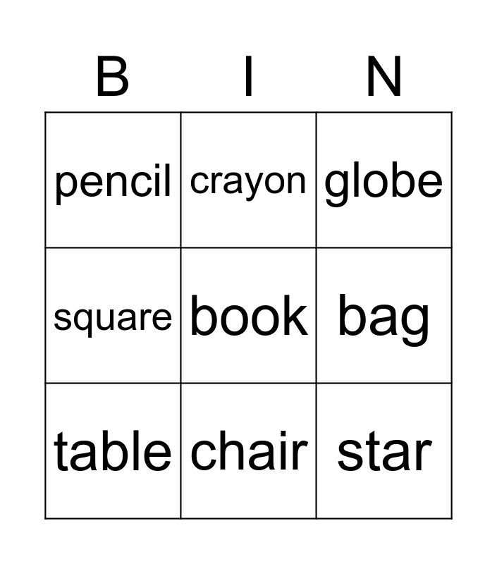 This bingo card has a free space and 8 words: bag, globe, crayon, table, pencil, star, square and chair.