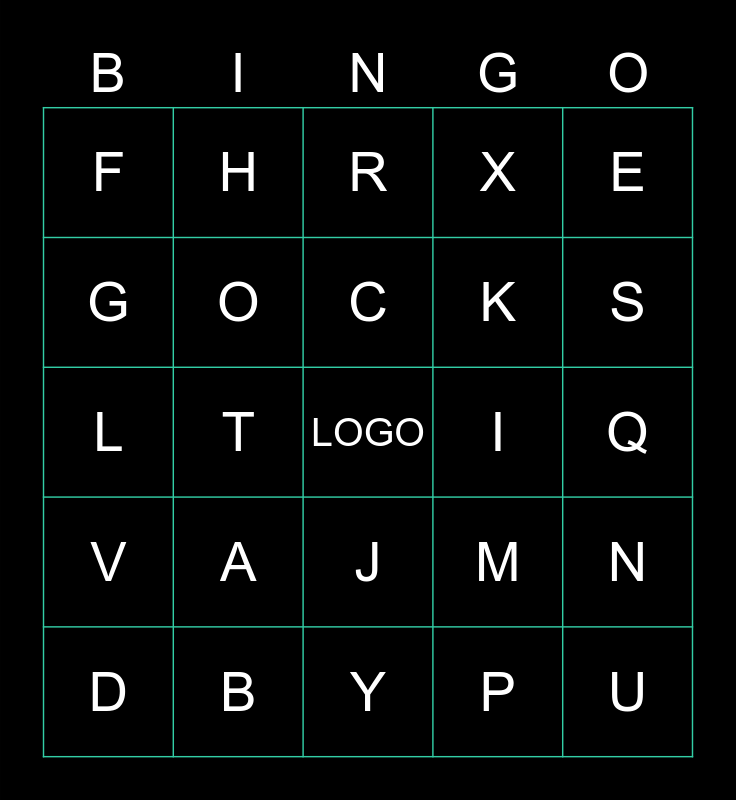 This bingo card has a free space and 24 words: A, B, C, D, E, F, G, H, I, J, K, L, M, N, O, P, Q, R, S, T, U, V, X and Y.