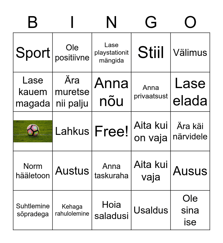 This bingo card has 1 images, a free space and 23 words: Austus, Kehaga rahulolemine, Anna nõu, Suhtlemine sõpradega, Välimus, Sport, Lase kauem magada, Ole positiivne, Aita kui on vaja, Anna taskuraha, Anna privaatsust, Aita kui vaja, Ausus, Ära muretse nii palju, Usaldus, Ära käi närvidele, Lase playstationit mängida, Lase elada, Lahkus, Ole sina ise, Norm hääletoon, Stiil and Hoia saladusi.