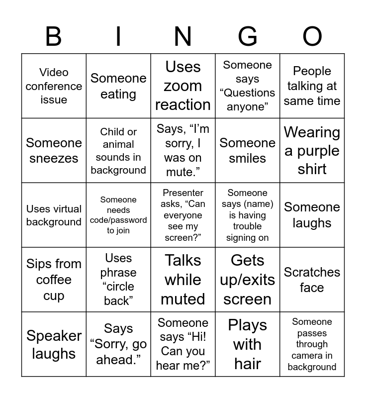 This bingo card has a free space and 24 words: Uses phrase “circle back”, Says “Sorry, go ahead.”, Says, “I’m sorry, I was on mute.”, Speaker laughs, People talking at same time, Video conference issue, Someone sneezes, Someone eating, Someone says (name) is having trouble signing on, Talks while muted, Someone smiles, Uses virtual background, Gets up/exits screen, Scratches face, Child or animal sounds in background, Plays with hair, Someone laughs, Uses zoom reaction, Wearing a purple shirt, Someone needs code/password to join, Someone passes through camera in background, Sips from coffee cup, Someone says “Questions anyone” and Someone says “Hi! Can you hear me?”.