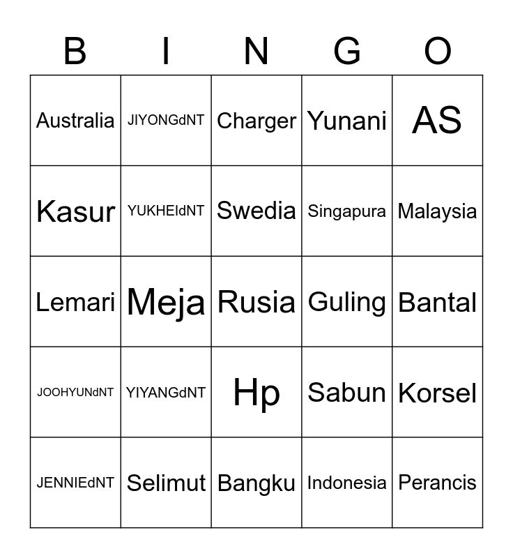 This bingo card has a free space and 24 words: YIYANGdNT, Selimut, Swedia, JENNIEdNT, AS, Australia, Kasur, JIYONGdNT, Guling, Hp, Singapura, Lemari, Sabun, Korsel, YUKHEIdNT, Indonesia, Bantal, Charger, Malaysia, Meja, Perancis, JOOHYUNdNT, Yunani and Bangku.
