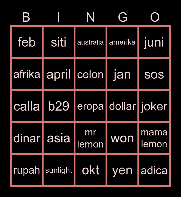 This bingo card has a free space and 24 words: asia, sunlight, celon, rupah, juni, feb, afrika, siti, dollar, mr lemon, jan, calla, won, mama lemon, april, yen, joker, australia, sos, b29, adica, dinar, amerika and okt.