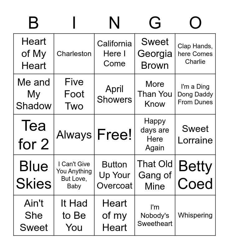 This bingo card has a free space and 24 words: I Can't Give You Anything But Love, Baby, It Had to Be You, April Showers, Ain't She Sweet, Clap Hands, here Comes Charlie, Heart of My Heart, Me and My Shadow, Charleston, Happy days are Here Again, Button Up Your Overcoat, More Than You Know, Tea for 2, That Old Gang of Mine, Betty Coed, Five Foot Two, I'm Nobody's Sweetheart, Sweet Lorraine, California Here I Come, I'm a Ding Dong Daddy From Dunes, Always, Whispering, Blue Skies, Sweet Georgia Brown and Heart of my Heart.