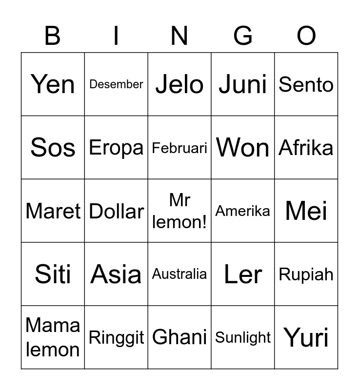This bingo card has a free space and 24 words: Mama lemon, Asia, Februari, Sunlight, Sento, Yen, Desember, Jelo, Amerika, Mei, Maret, Eropa, Ler, Rupiah, Sos, Ringgit, Ghani, Juni, Afrika, Siti, Dollar, Australia, Won and Yuri.