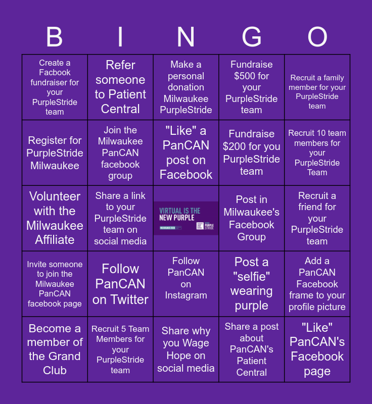 This bingo card has a free space and 24 words: Follow PanCAN on Twitter, Recruit 5 Team Members for your PurpleStride team, "Like" a PanCAN post on Facebook, Become a member of the Grand Club, Recruit a family member for your PurpleStride team, Create a Facbook fundraiser for your PurpleStride team, Register for PurpleStride Milwaukee, Refer someone to Patient Central, Post in Milwaukee's Facebook Group, Follow PanCAN on Instagram, Fundraise $200 for you PurpleStride team, Volunteer with the Milwaukee Affiliate, Post a "selfie" wearing purple, Add a PanCAN Facebook frame to your profile picture, Join the Milwaukee PanCAN facebook group, Share a post about PanCAN's Patient Central, Recruit a friend for your PurpleStride team, Make a personal donation Milwaukee PurpleStride, Recruit 10 team members for your PurpleStride Team, Share a link to your PurpleStride team on social media, "Like" PanCAN's Facebook page, Invite someone to join the Milwaukee PanCAN facebook page, Fundraise $500 for your PurpleStride team and Share why you Wage Hope on social media.