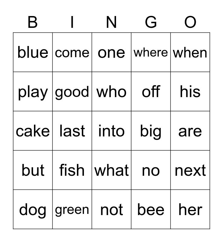 This bingo card has 25 words: fish, not, who, dog, when, blue, play, come, big, what, off, cake, no, next, good, her, are, one, his, last, into, green, but, where and bee.