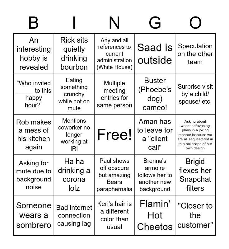 This bingo card has a free space and 24 words: Ha ha drinking a corona lolz, Bad internet connection causing lag, Multiple meeting entries for same person, Someone wears a sombrero, Speculation on the other team, An interesting hobby is revealed, "Who invited _____ to this happy hour?", Rick sits quietly drinking bourbon, Aman has to leave for a "client call", Paul shows off obscure but amazing Bears paraphernalia, Buster (Phoebe's dog) cameo!, Rob makes a mess of his kitchen again, Brenna's armoire follows her to another new background, Brigid flexes her Snapchat filters, Eating something crunchy while not on mute, Flamin' Hot Cheetos, Asking about weekend/evening plans in a joking manner because we are all sequestered in to a hellscape of our own design, Any and all references to current administration (White House), Surprise visit by a child/ spouse/ etc., Mentions coworker no longer working at IRI, "Closer to the customer", Asking for mute due to background noise, Saad is outside and Keri's hair is a different color than usual.