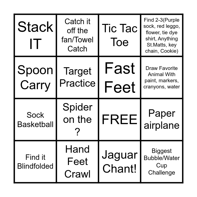This bingo card has 16 words: Hand Feet Crawl, Paper airplane, Tic Tac Toe, Stack IT, Sock Basketball, Catch it off the fan/Towel Catch, FREE, Jaguar Chant!, Spoon Carry, Target Practice, Find it Blindfolded, Find 2-3(Purple sock, red leggo, flower, tie dye shirt, Anything St.Matts, key chain, Cookie), Spider on the ?, Draw Favorite Animal With paint, markers, cranyons, water, Fast Feet and Biggest Bubble/Water Cup Challenge.
