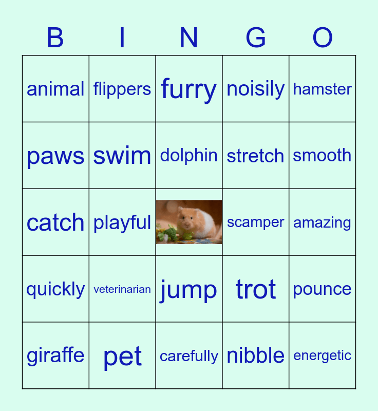 This bingo card has a free space and 24 words: veterinarian, pet, dolphin, giraffe, hamster, animal, paws, flippers, scamper, jump, stretch, catch, trot, pounce, swim, nibble, amazing, furry, smooth, playful, energetic, quickly, noisily and carefully.