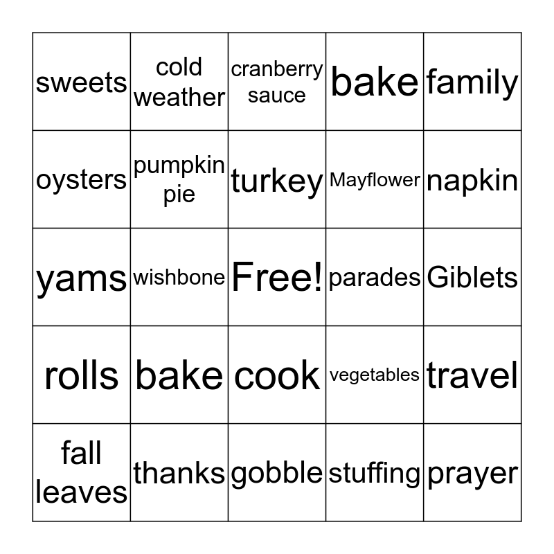 This bingo card has a free space and 24 words: bake, thanks, turkey, fall leaves, family, sweets, oysters, cold weather, parades, cook, Mayflower, yams, vegetables, travel, pumpkin pie, stuffing, Giblets, cranberry sauce, napkin, wishbone, prayer, rolls, bake and gobble.