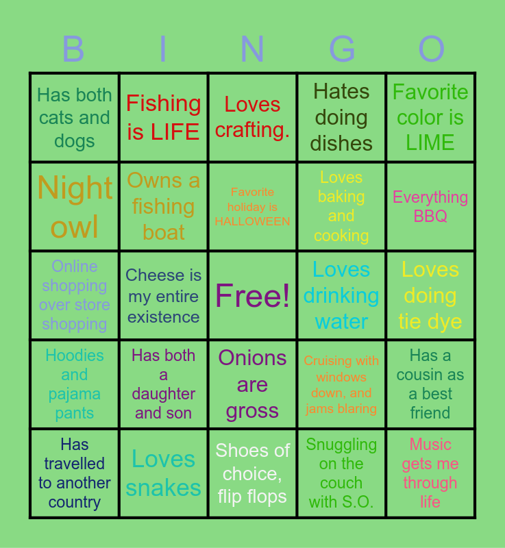 This bingo card has a free space and 24 words: Has both a daughter and son, Loves snakes, Favorite holiday is HALLOWEEN, Has travelled to another country, Favorite color is LIME, Has both cats and dogs, Night owl, Fishing is LIFE, Loves drinking water, Onions are gross, Loves baking and cooking, Online shopping over store shopping, Cruising with windows down, and jams blaring, Has a cousin as a best friend, Owns a fishing boat, Snuggling on the couch with S.O., Loves doing tie dye, Loves crafting., Everything BBQ, Cheese is my entire existence, Music gets me through life, Hoodies and pajama pants, Hates doing dishes and Shoes of choice, flip flops.