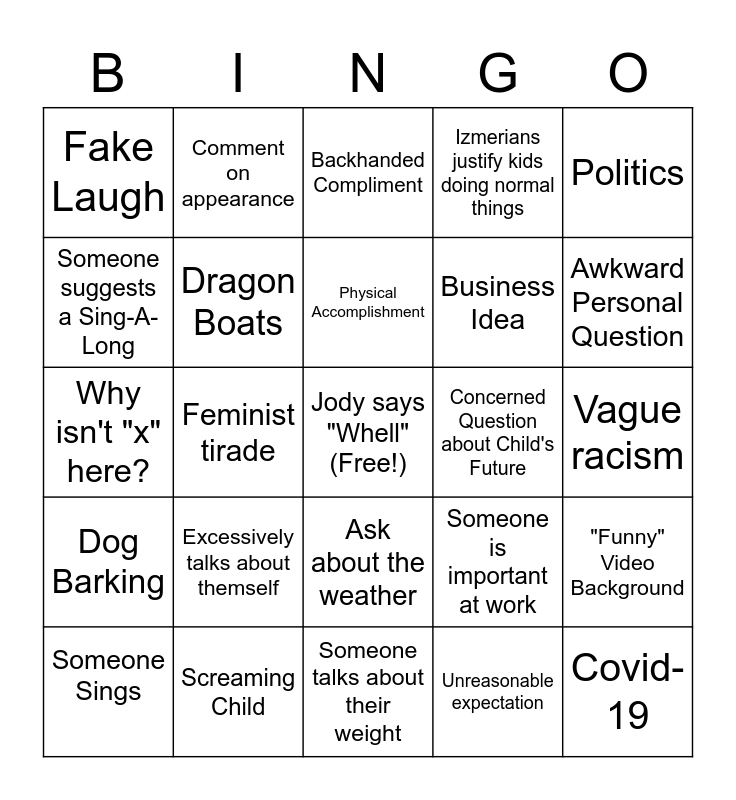 This bingo card has a free space and 28 words: "Funny" Video Background, Brags about their kid, Business Idea, Unreasonable expectation, Someone suggests a Sing-A-Long, Backhanded Compliment, Comment on appearance, Dog Barking, Concerned Question about Child's Future, Someone Sings, Why isn't "x" here?, Izmerians justify kids doing normal things, Screaming Child, Someone talks about their weight, Awkward Personal Question, Bagpipes (At all), Excessively talks about themself, Dragon Boats, Physical Accomplishment, Ask about the weather, Fake Laugh, Someone loves getting the fam together on zoom, Covid-19, Feminist tirade, Vague racism, Someone is important at work, Politics and Claims of supernatural powers.