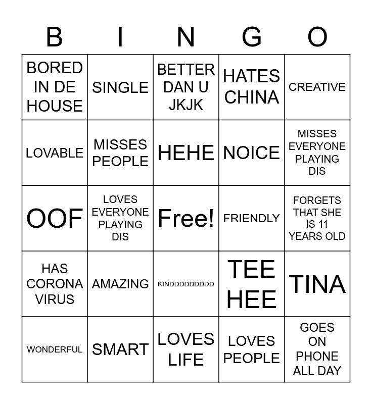 This bingo card has a free space and 24 words: AMAZING, SMART, HEHE, WONDERFUL, CREATIVE, BORED IN DE HOUSE, LOVABLE, SINGLE, FRIENDLY, KINDDDDDDDDD, NOICE, OOF, TEE HEE, TINA, MISSES PEOPLE, LOVES PEOPLE, FORGETS THAT SHE IS 11 YEARS OLD, BETTER DAN U JKJK, MISSES EVERYONE PLAYING DIS, LOVES EVERYONE PLAYING DIS, GOES ON PHONE ALL DAY, HAS CORONA VIRUS, HATES CHINA and LOVES LIFE.