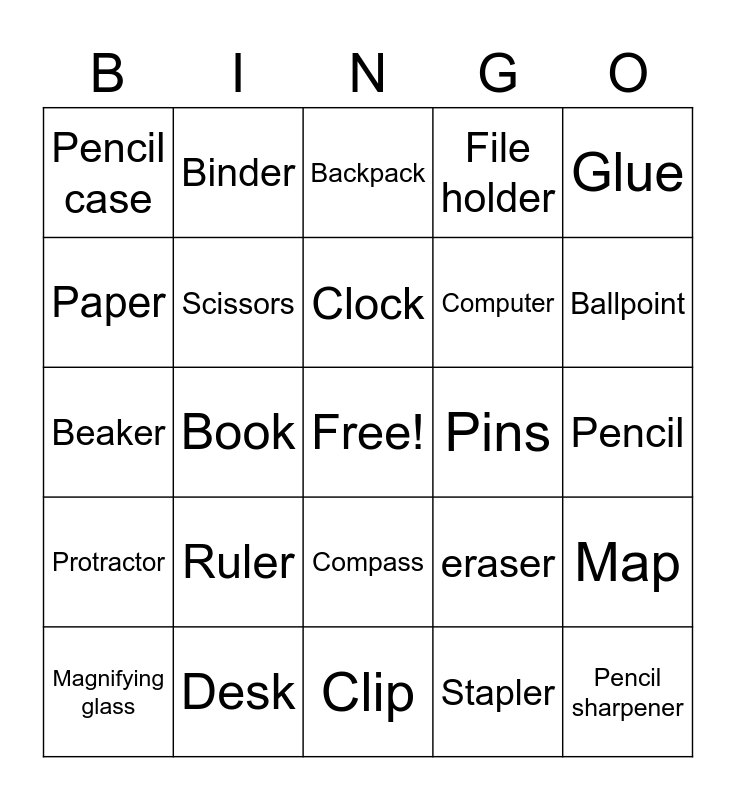 This bingo card has a free space and 30 words: Desk, Chair, Book, Notebook, Pencil case, Backpack, Scissors, Compass, Pins, Clip, Pencil, Pencil sharpener, Stapler, Calculator, Ballpoint, Highlighter, eraser, Protractor, Ruler, Glue, Beaker, Funnel, Binder, Computer, Paper, File holder, Map, Magnifying glass, Clock and Blackboard.