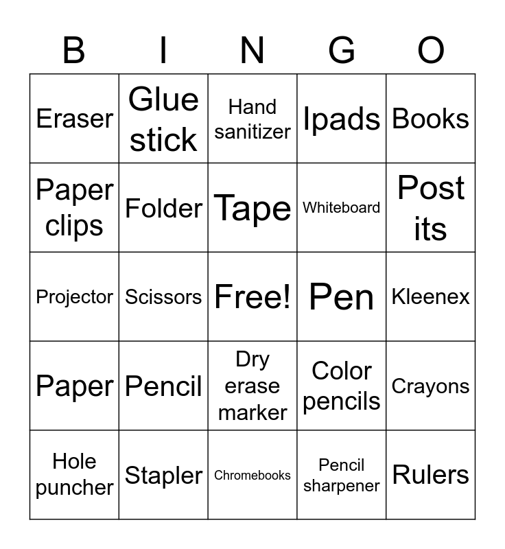 This bingo card has a free space and 24 words: Pencil, Stapler, Tape, Hole puncher, Books, Eraser, Paper clips, Glue stick, Pen, Dry erase marker, Whiteboard, Projector, Color pencils, Crayons, Folder, Pencil sharpener, Kleenex, Hand sanitizer, Post its, Scissors, Rulers, Paper, Ipads and Chromebooks.