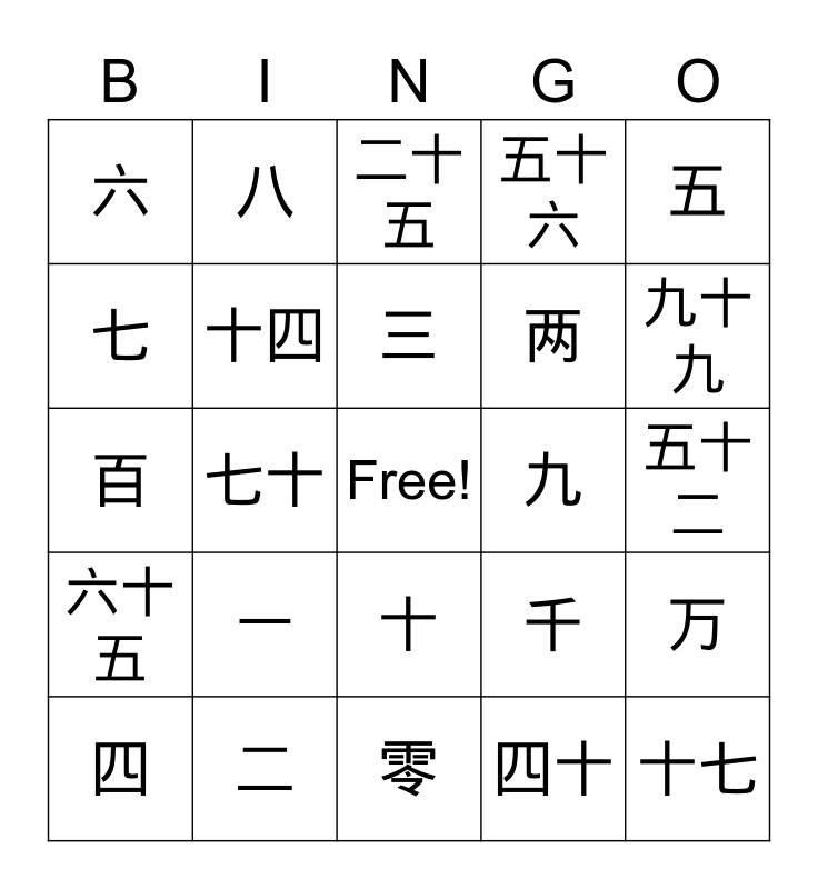 This bingo card has a free space and 24 words: 一, 二, 三, 四, 五, 六, 七, 八, 九, 十, 两, 百, 千, 万, 十四, 四十, 五十二, 二十五, 九十九, 七十, 十七, 六十五, 五十六 and 零.
