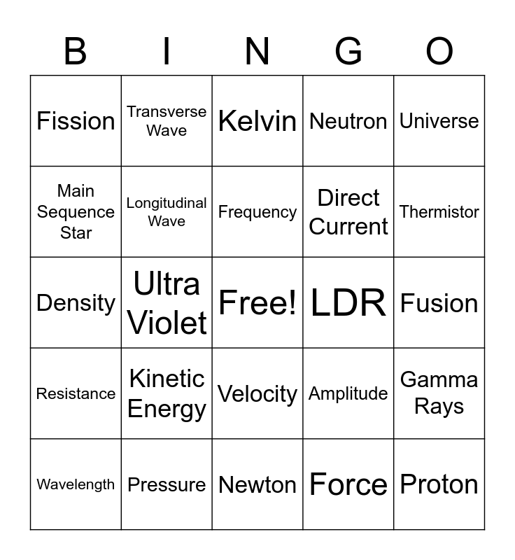 This bingo card has a free space and 34 words: Gravitational Energy, Force, Black Hole, Acceleration, Resistance, Longitudinal Wave, Universe, Wavelength, Transverse Wave, Voltage, Frequency, Kelvin, Current, Period, LDR, Thermistor, Pressure, Density, Kinetic Energy, Amplitude, Velocity, Half Life, Fission, Fusion, Newton, Proton, Neutron, Alternating Current, Direct Current, Main Sequence Star, Microwaves, Ultra Violet, Gamma Rays and Alpha Particle.