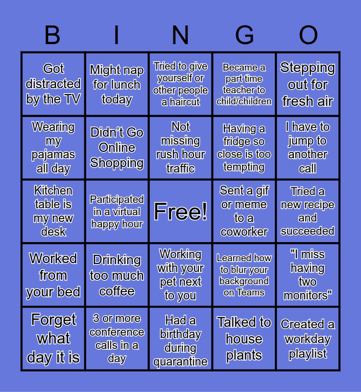This bingo card has a free space and 24 words: Drinking too much coffee, 3 or more conference calls in a day, Not missing rush hour traffic, Forget what day it is, Stepping out for fresh air, Got distracted by the TV, Wearing my pajamas all day, Might nap for lunch today, Sent a gif or meme to a coworker, Working with your pet next to you, Having a fridge so close is too tempting, Kitchen table is my new desk, Learned how to blur your background on Teams, "I miss having two monitors", Didn’t Go Online Shopping, Talked to house plants, Tried a new recipe and succeeded, Tried to give yourself or other people a haircut, I have to jump to another call, Participated in a virtual happy hour, Created a workday playlist, Worked from your bed, Became a part time teacher to child/children and Had a birthday during quarantine.