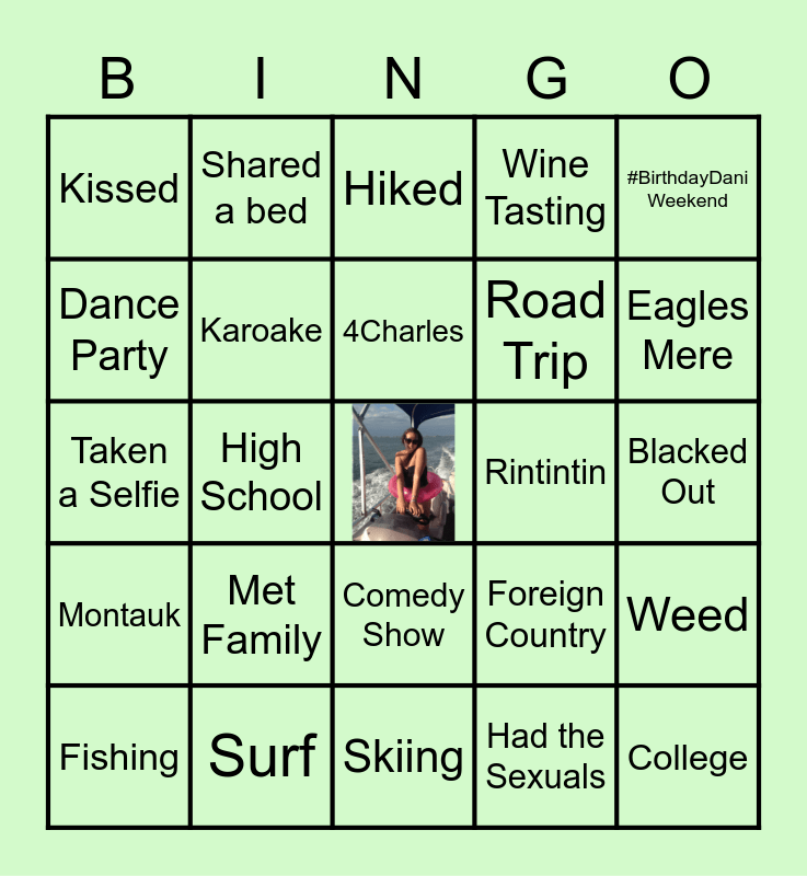This bingo card has a free space and 49 words: Been on a Boat, College, Beach, Skiing, Met Family, Traveled, Shared a bed, Cried, Dance Party, Flew, Karoake, Wine Tasting, Weed, Foreign Country, Eskimo Sisters, Met Yellow, 4Charles, Rintintin, Rose Cafe, #BirthdayDani Weekend, High School, Had the Sexuals, Kissed, Road Trip, Lived With, Eagles Mere, Fishing, LSD, Comedy Show, Montauk, Camping, Skinny Dipping, Liars, NYE, Surf, Tree Decorating Party, Hung out during a Hurriance, Cape Cod, Blacked Out, Camping, Concert, Worked Together, Been to Apt 170, Cooked together, Taken a Selfie, Hiked, Lure, Attended a wedding and Astrology Fun.